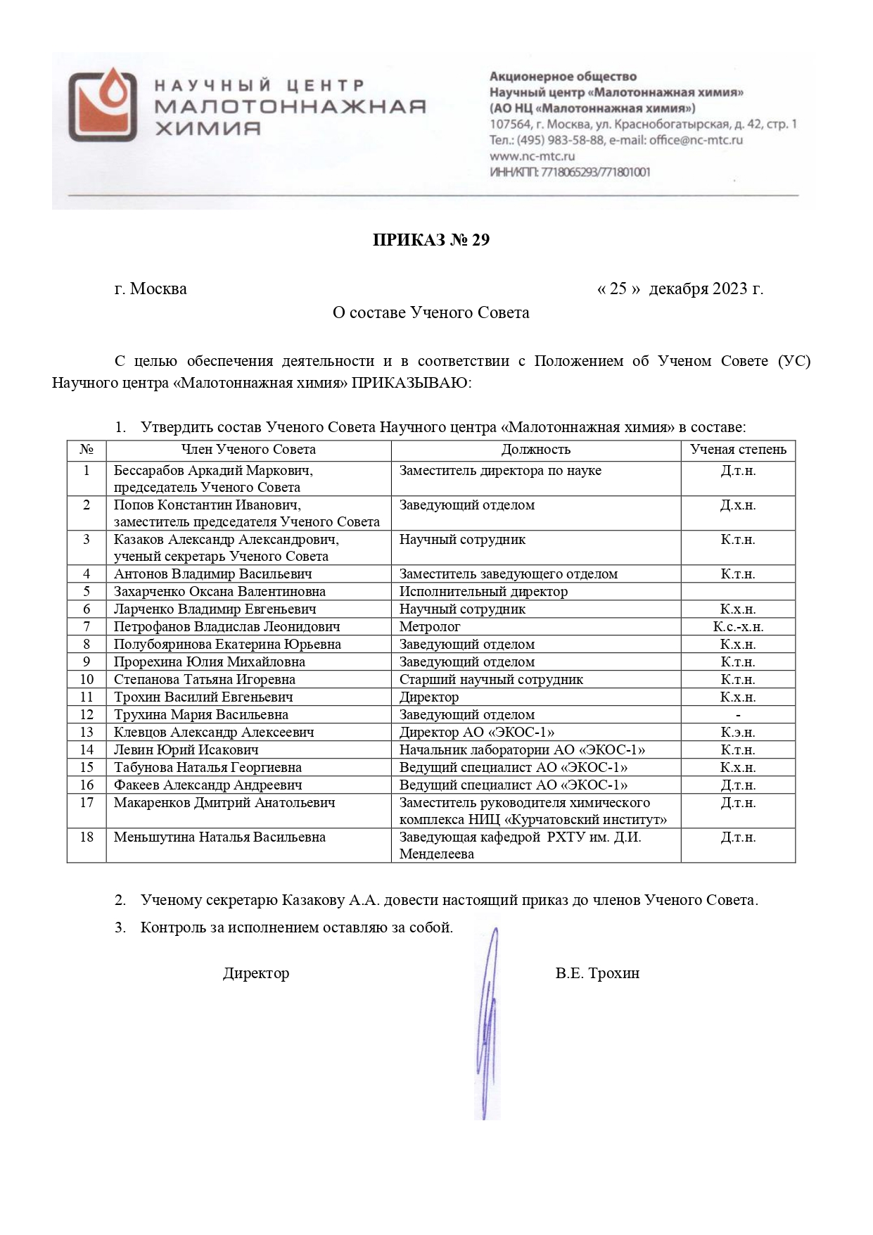Приказ № 29 О составе Ученого Совета